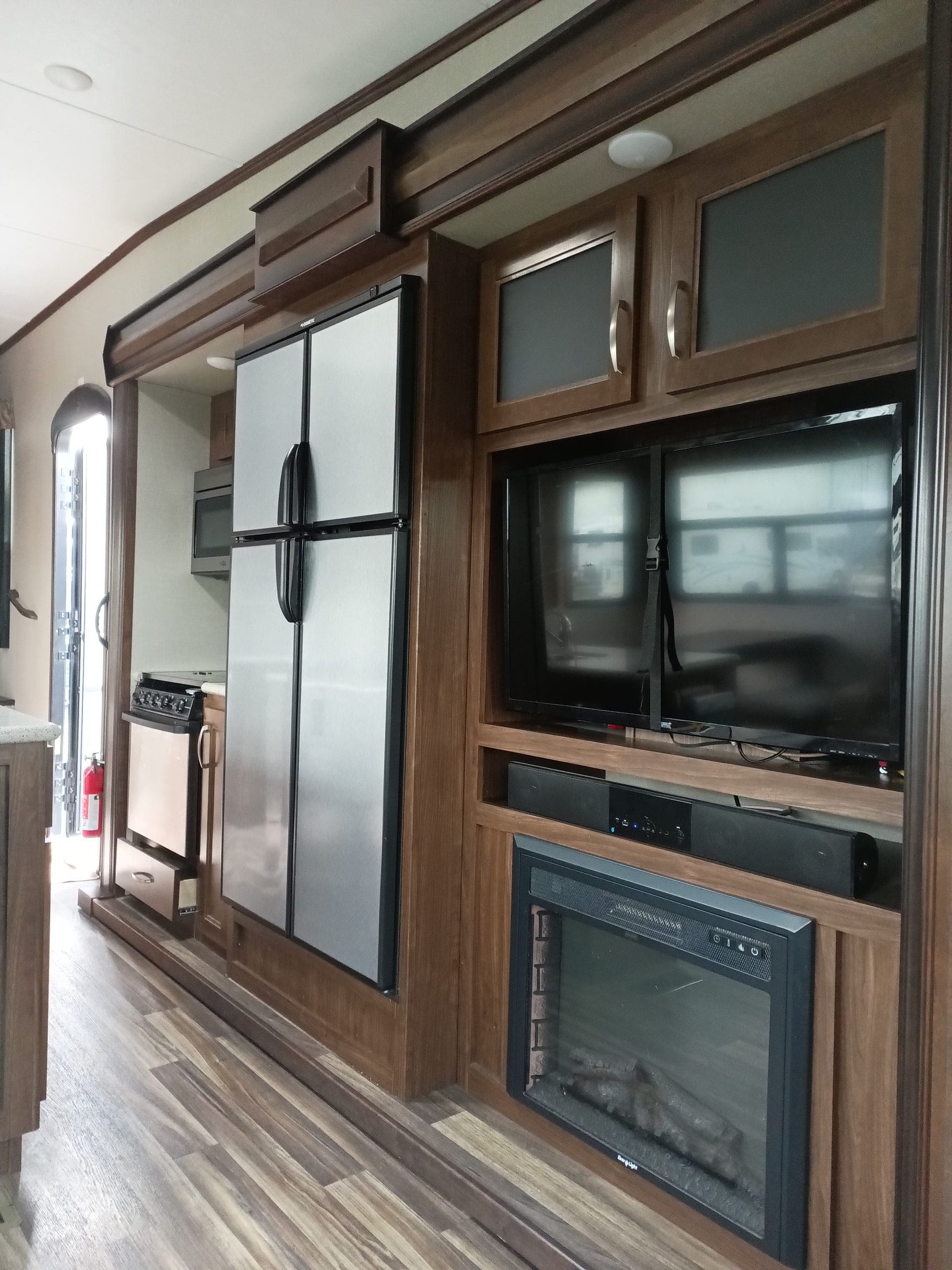 Kitchen: Includes a 12 cu. ft. four-door refrigerator, a 3-burner cooktop, and a 30" over-the-range microwave.