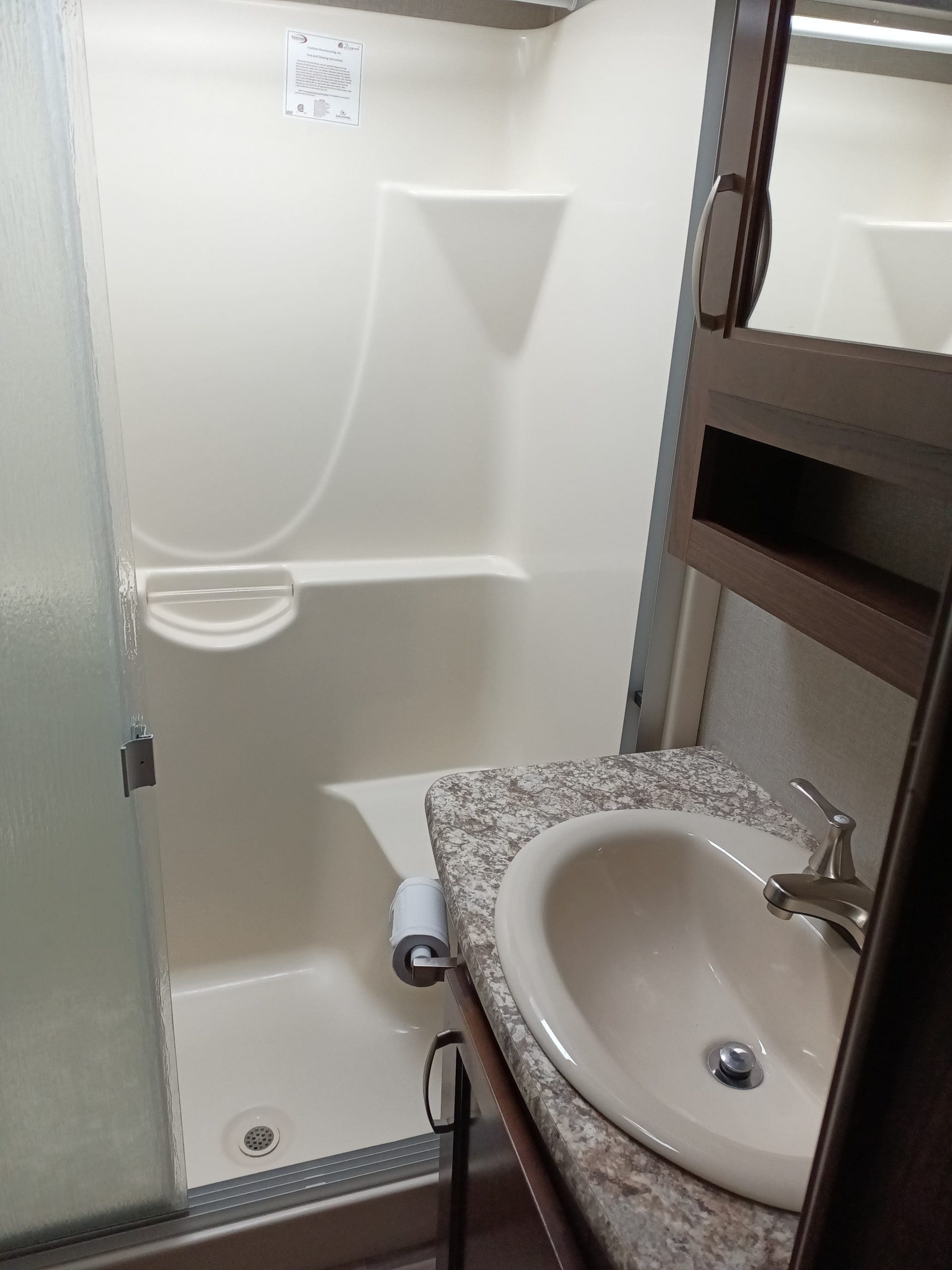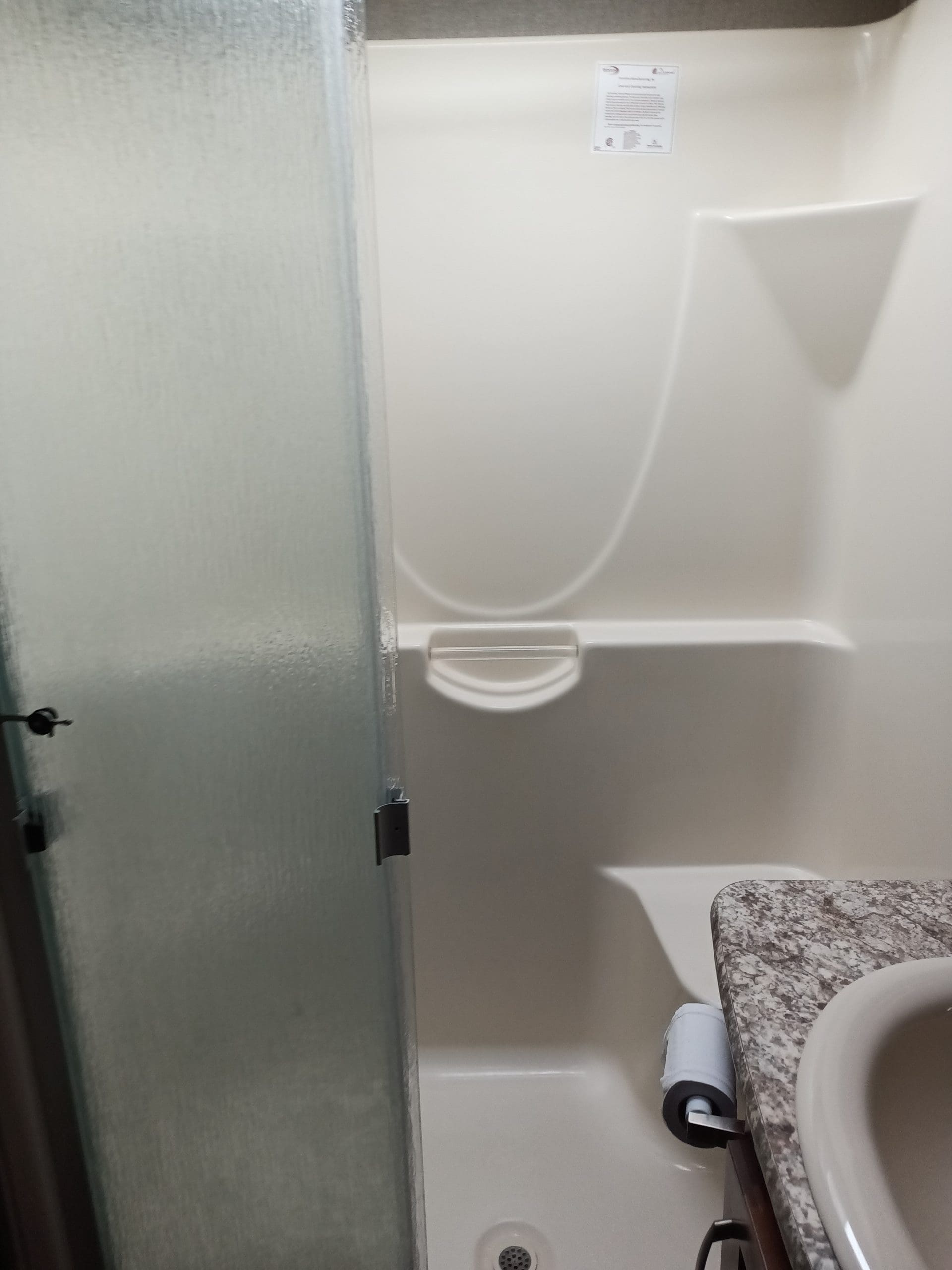 Bathroom: Features a 48" x 30" fiberglass shower with a seat and a porcelain foot-flush toilet