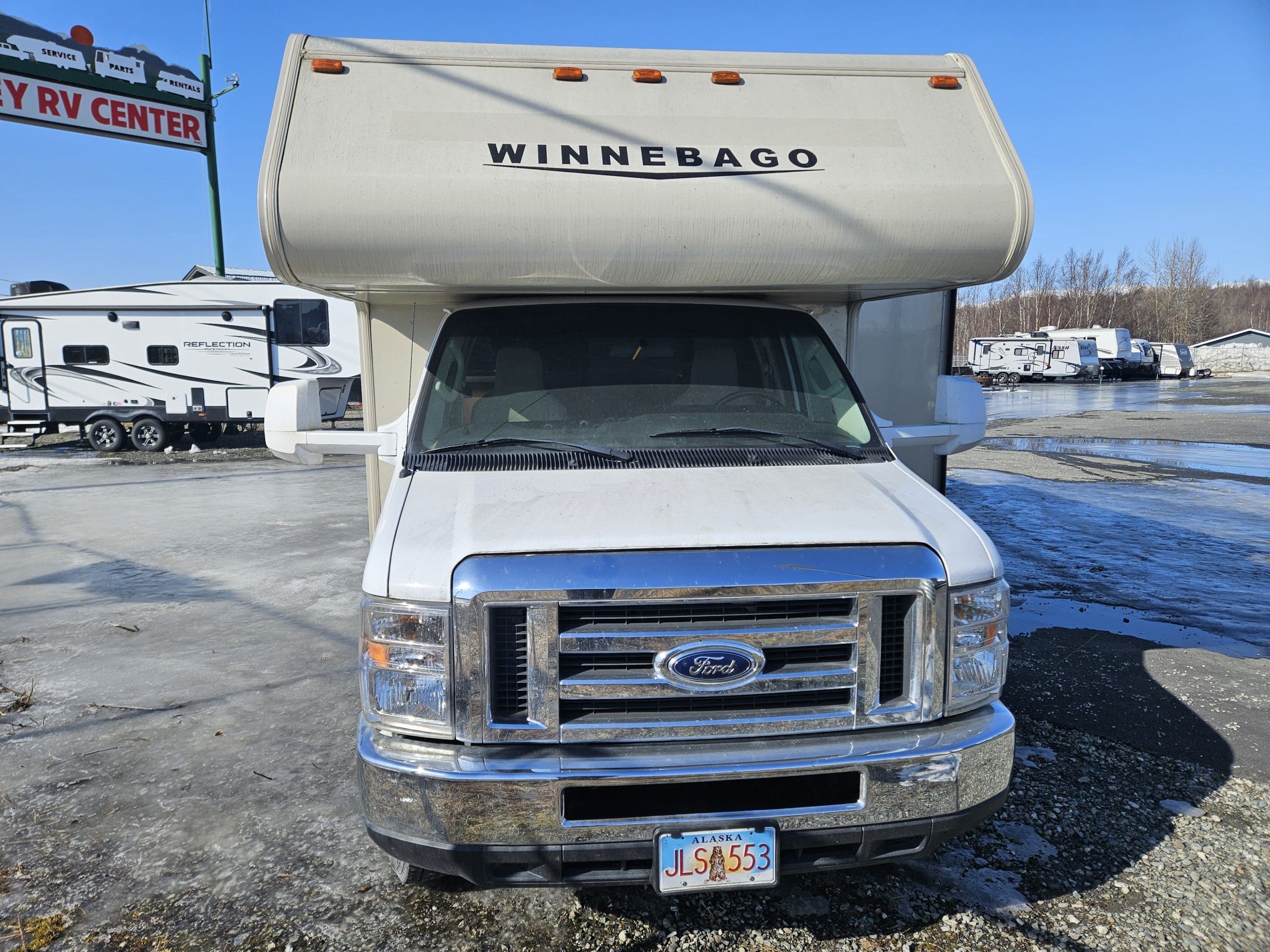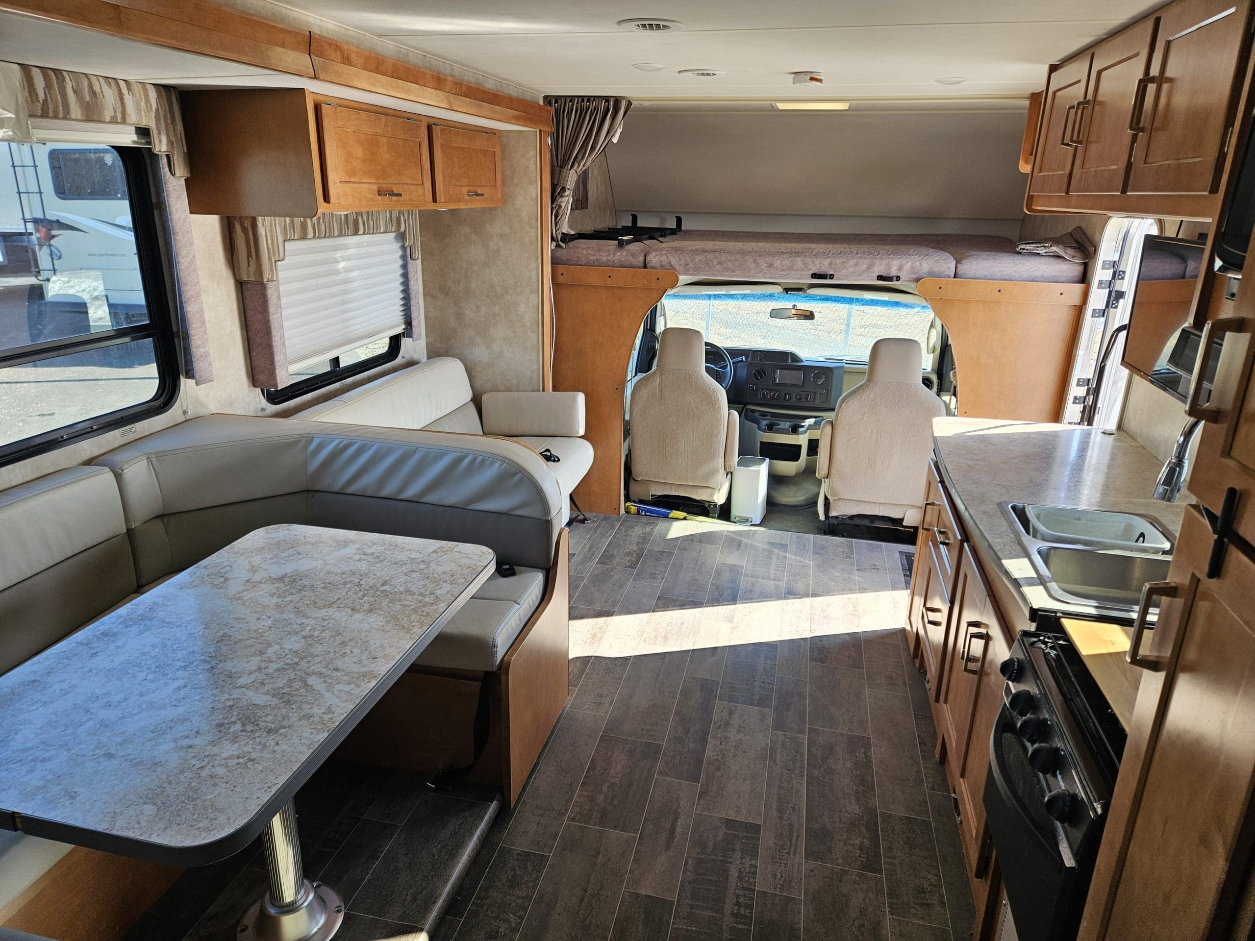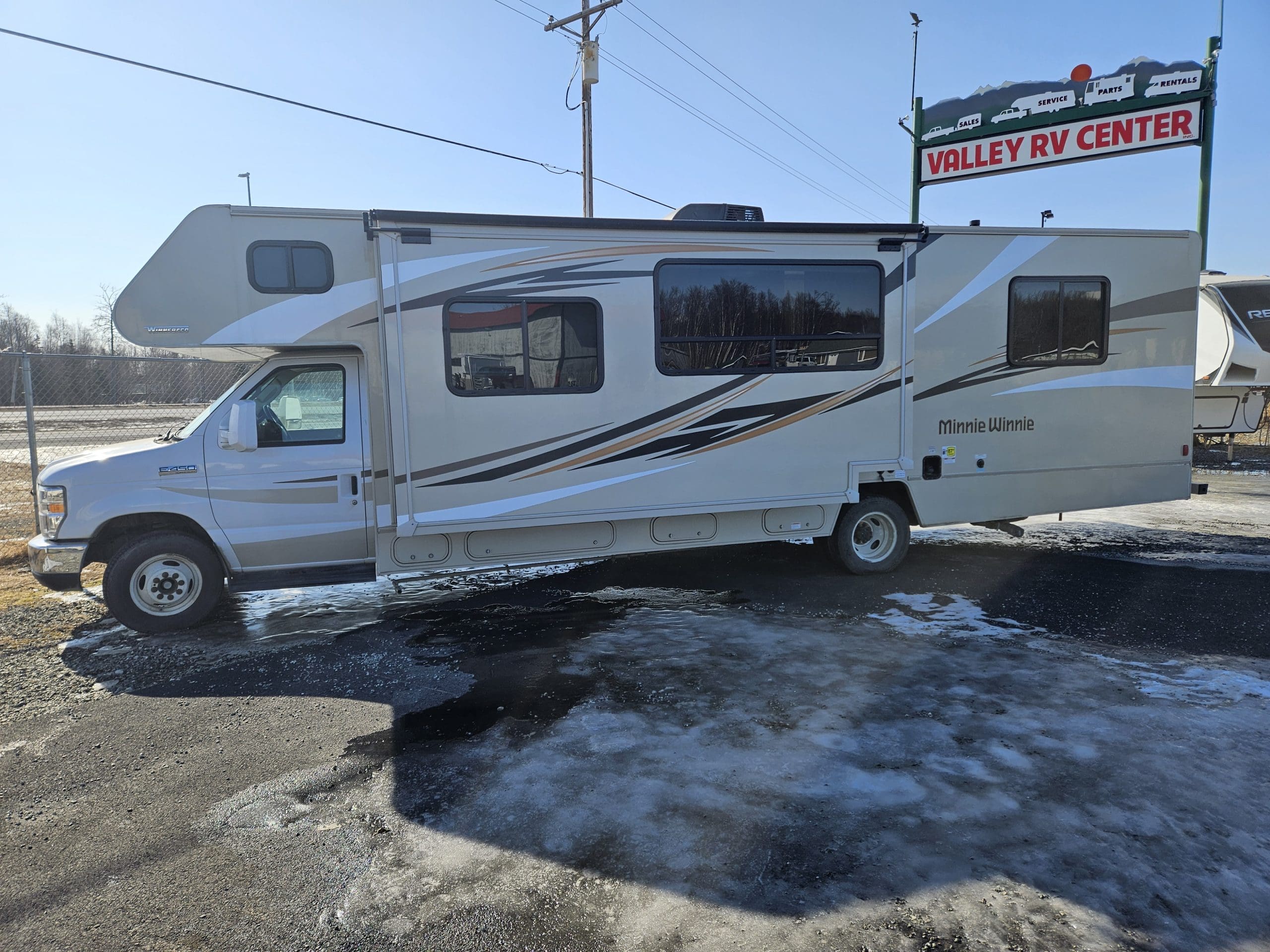 The 2019 Winnebago Minnie Winnie 31K is a 32'9" Class C motorhome on a Ford E450 chassis featuring a single large slide-out in the living area. It sleeps up to 7 people with a rear queen bed, sofa/bed, convertible dinette, and overhead bunk. Key features include a mid-coach split bath, a full galley, and 108 cu. ft. of exterior storage.